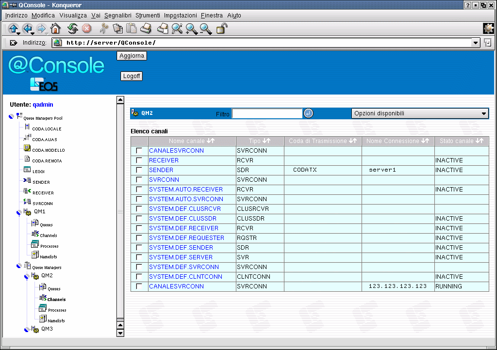 QConsole: "take sides" with business integration Companies must face every day with the growing challenge to communicate with people, partners, customers, suppliers from all over the world, with different languages, habits, time zones and so on. The primary feature of IBM WebSphere MQ middleware is exactly the ability to let different IT platforms communicate in a very secure and affordable way and indipendently from languages and operanting systems. Most companies have already chosen this opportunity, that today represents the hearth of business integration, and the message queuing technology becames essential to solve their applications integration problems. WebSphere MQ has a plenty of powerful features but, at the same time, people need to be able to configure and manage each of them. For this reason customers asks for a solution that could help them to take full control of all the features of WebSphere MQ. Today, this full contol and also all the management functions required to assure the reliable transfer of thousands of information, is offered by QConsole. Designed by Gruppo Eos, IBM Business Partner Software Premier, this solution comes from everyday experience ripe on field with their own customers. |
